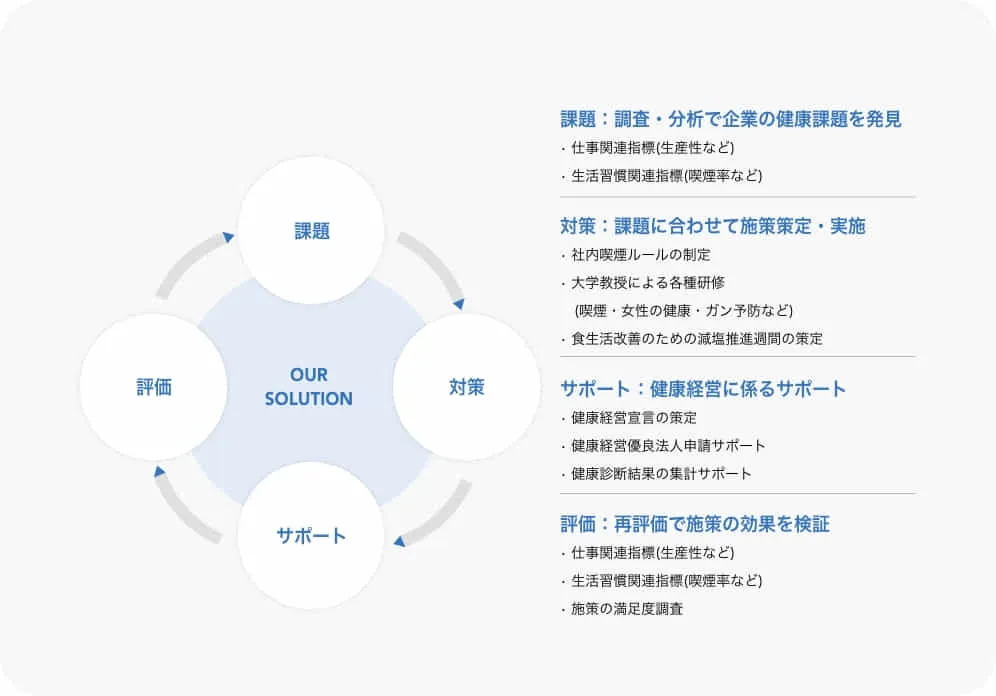 弊社では、伴走型の健康経営サポートとして、①課題、②対策、③サポート、④評価のサイクルを回していきます。パートナー企業様とは、このサイクルの中の一部をお互いに補完し合い、より良い健康経営サービスを構築していけたらと思います。