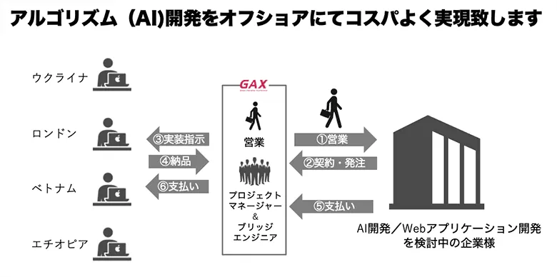 ウクライナ、ロンドン、ベトナム、エチオピアのオフショア開発会社とのネットワークを駆使し、AI開発、Webアプリケーション開発を行っています。