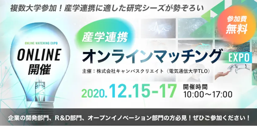 これからの産学連携の在り方を模索する中で、今回キャンパスクリエイトが主催するオンラインイベントは、大きな意味を持つ。『産学連携オンラインマッチングEXPO』は、2020年12月15日、16日、17日の3日間開催。大学、国立研究開発法人、大学発ベンチャーが数多く出展し、研究者・開発者によるプレゼン、研究・技術展示、来場者と出展者と面談が行われる。DX時代の未来を見据え、産学連携に取り組みたいという人は、ぜひ参加してみてほしい。