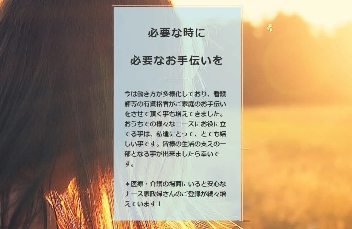 具体的には、産前産後の世話、子供の世話、入退院時の付き添い、退院環境をを整える、旅行添乗、家庭生活のサポート、掃除、料理、在宅でのお看取りが近い方の付き添い、在宅療養の方の付き添い、介護等。