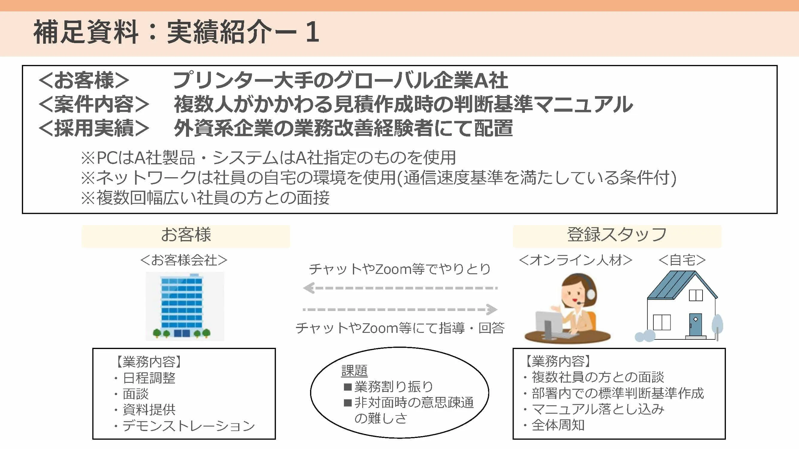 2..副業を希望する人に、自宅を拠点とした業務の請け負い方や、見積もりの作り方、メールでのマナーなどを教えている。(社内の研修として)