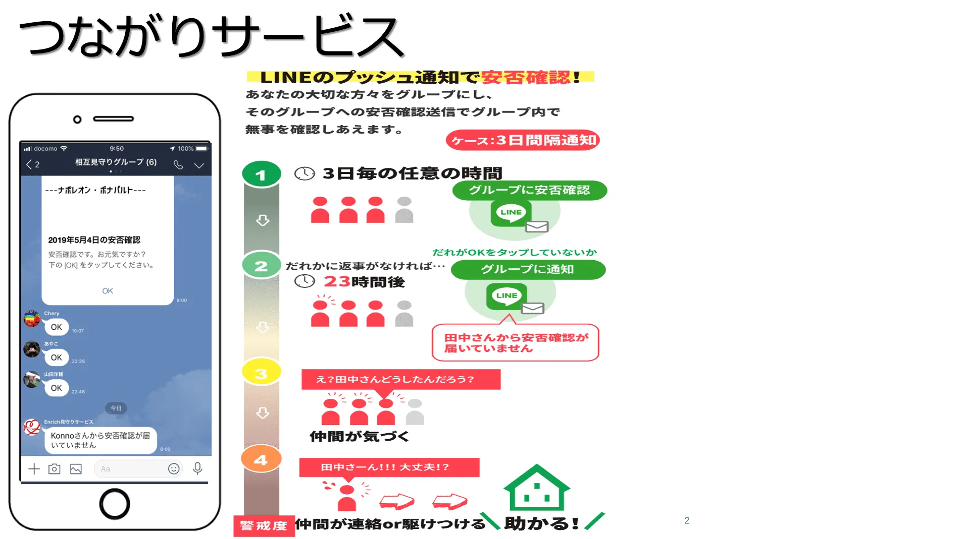 「グループLINEによるつながりサービス」 一定の距離を保ちつつ気になる方とグループでお互いが無事を確認。 親子3世代、単身赴任の夫と妻、還暦を迎える小学校の同窓生、友人グループ、生活支援コーディネータとケア対象の高齢者、物件オーナ・管理人と居住者、自治会、町内会など。人とのつながりで、個人情報の登録の必要がありません。