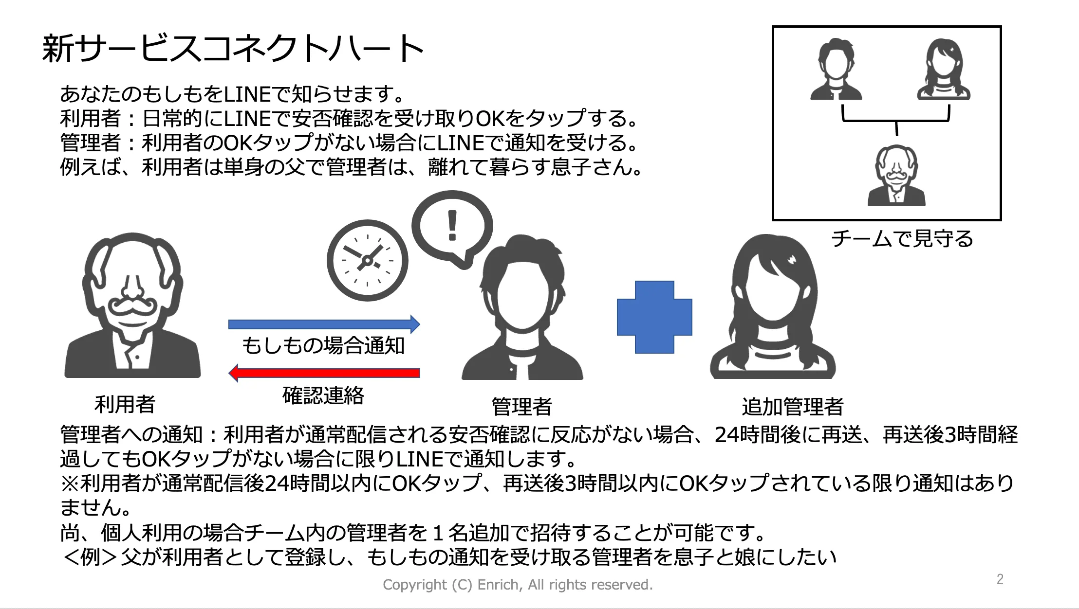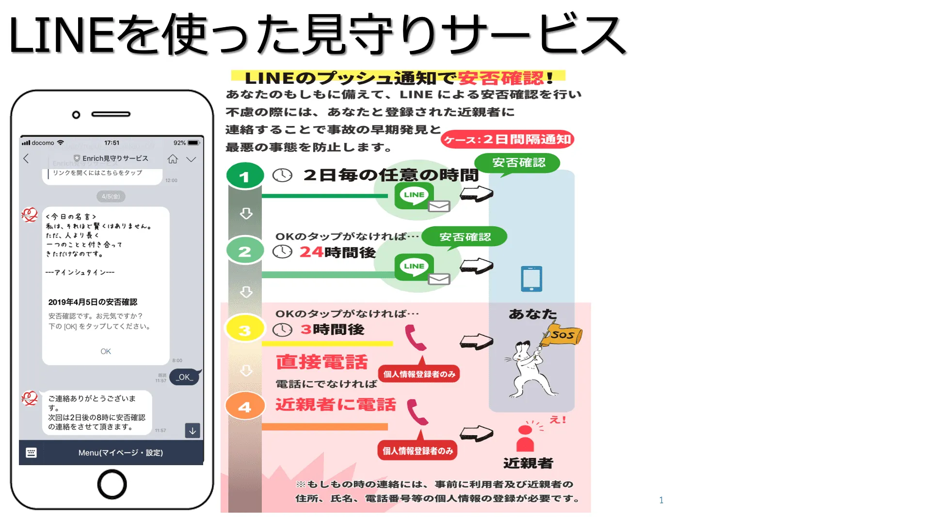 「LINEを使った見守りサービス」 プッシュ通知で利用者が設定した任意の配信間隔(1〜3日)と時間帯(0〜23時)に安否確認を送信。 利用者はその通知に対してOKをタップするだけ。 もし、OKを忘れた場合は24時間後に再送し更に3時間経過しても確認されない場合は、直接利用者に電話連絡して確認。利用者とコンタクトできない場合は、登録された近親者に連絡して状況をお知らせ。