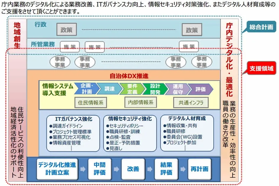 主に地方公共団体や中央省庁の公共分野においてIT導入、ITガバナンス、情報セキュリティに関する各種支援を行っております。大手ITベンダーにて公共担当SEとして長年在籍した経験を持つメンバーが多いことからIT技術の他、業務(特に地方公共団体)に関する知識が豊富で、マネジメントに関する領域でも力を発揮することができます。
