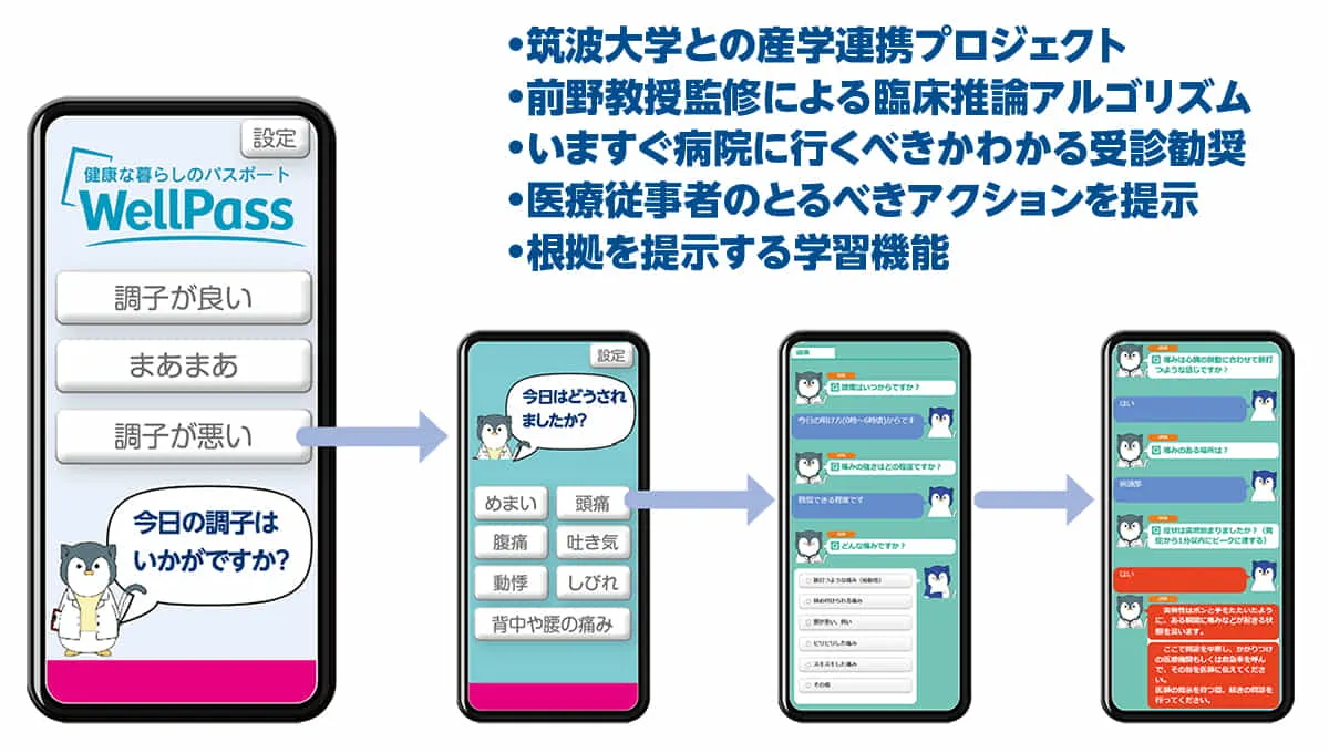 体の調子が悪いとき、いつでもどこでも手元のスマートフォンで、病院に行くべきか市販薬で様子をみていいかがわかる問診アプリ「WellPass®」を開発。