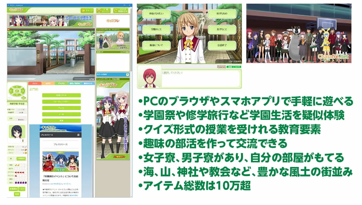 学園祭や季節行事などのイベントに参加したり、クイズ形式の授業を受けたりしながら、ネット越しに友だちを作って交流することができます。