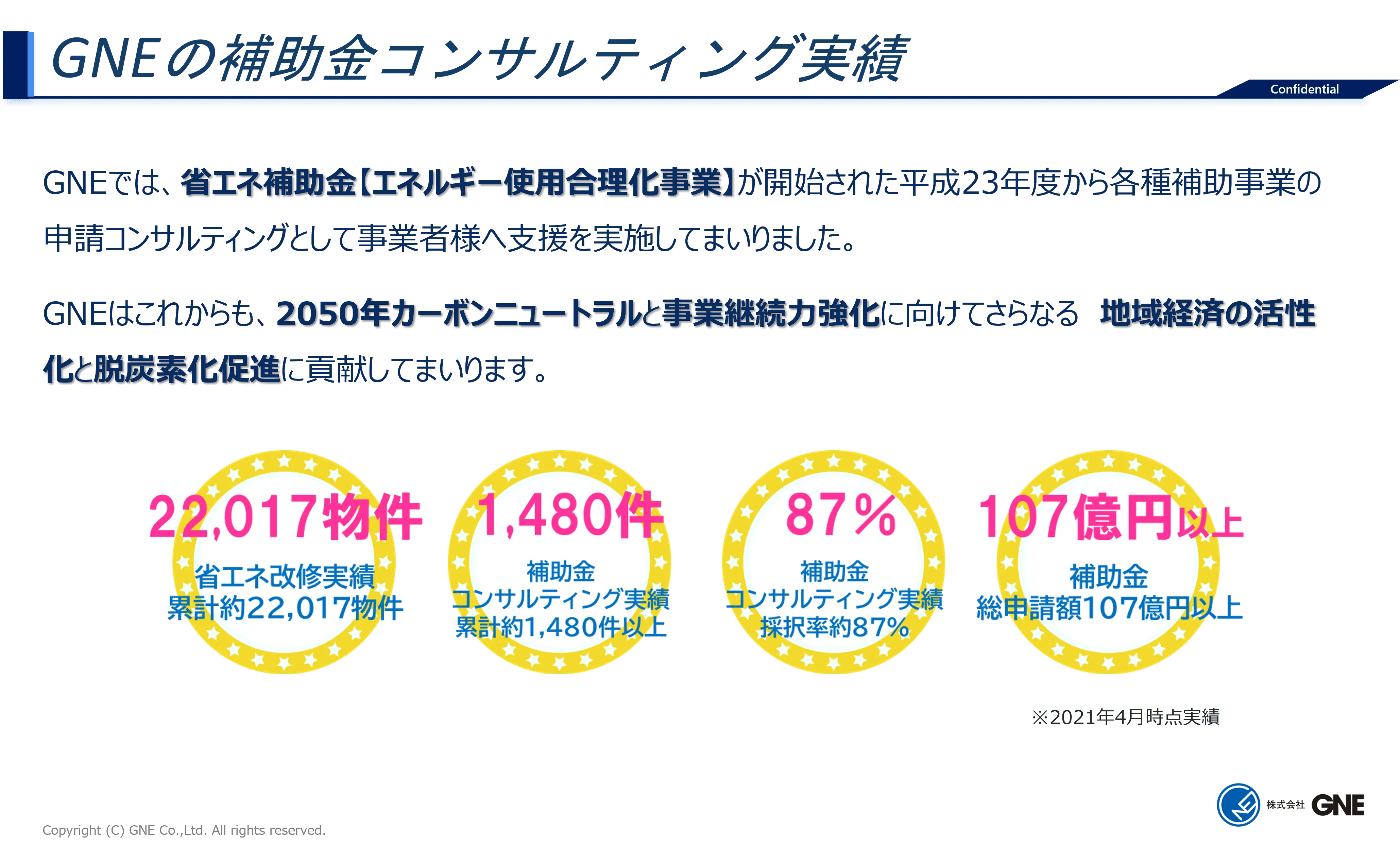 GNEでは、経済産業省の省エネ補助金【エネルギー使用合理化事業】が開始された平成23年度から各種補助事業の申請コンサルティングとして事業者様へ支援を実施してまいりました。