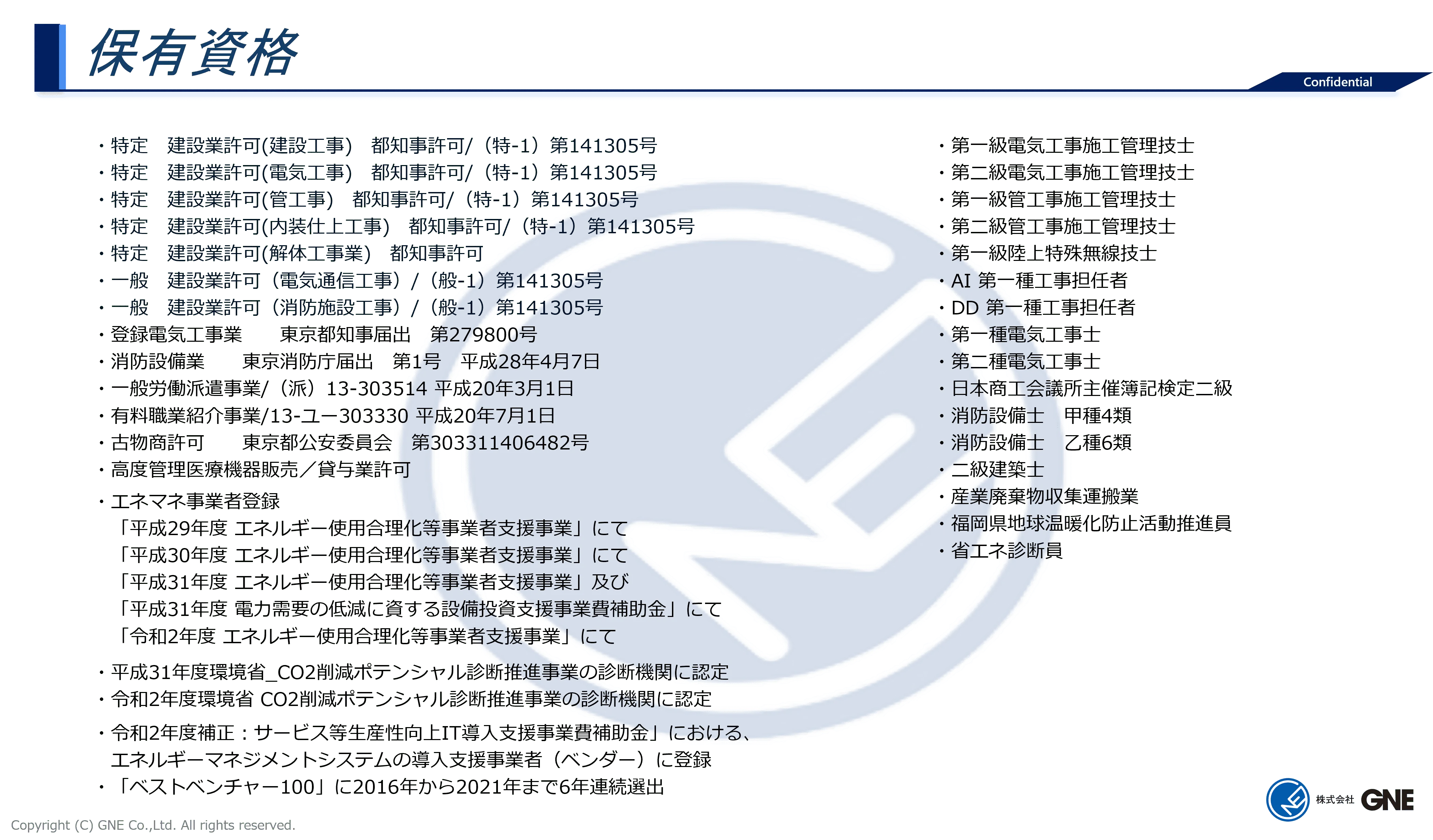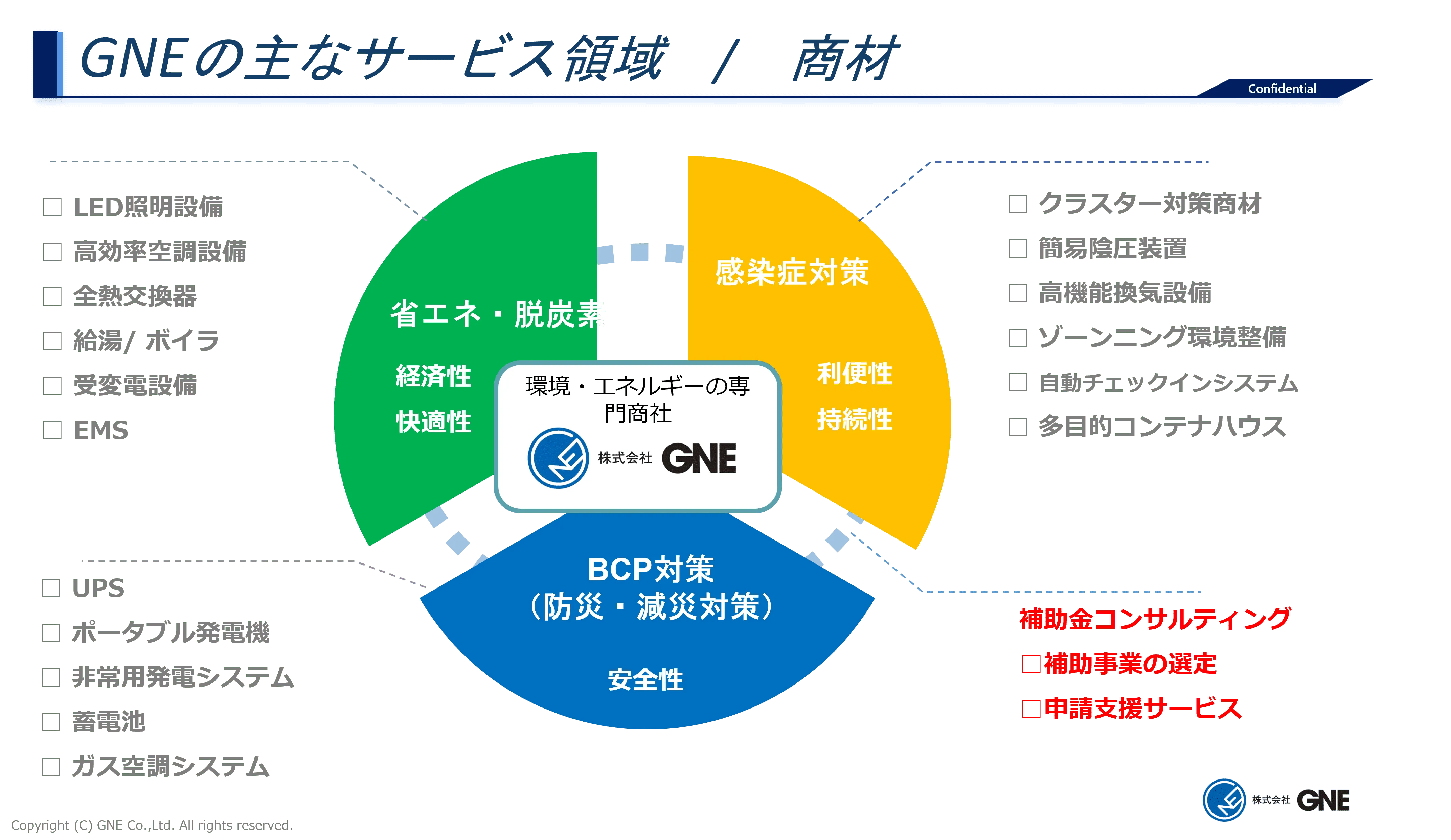 - 【事業概要】 事業者のSDGsの取り組みのサポートとして省エネルギーコンサルティング事業、補助⾦申請コンサルティング事業、BCP対策⽀援事業、感染症対策事業、メディア事業、電気⼯事を含む各種工事など