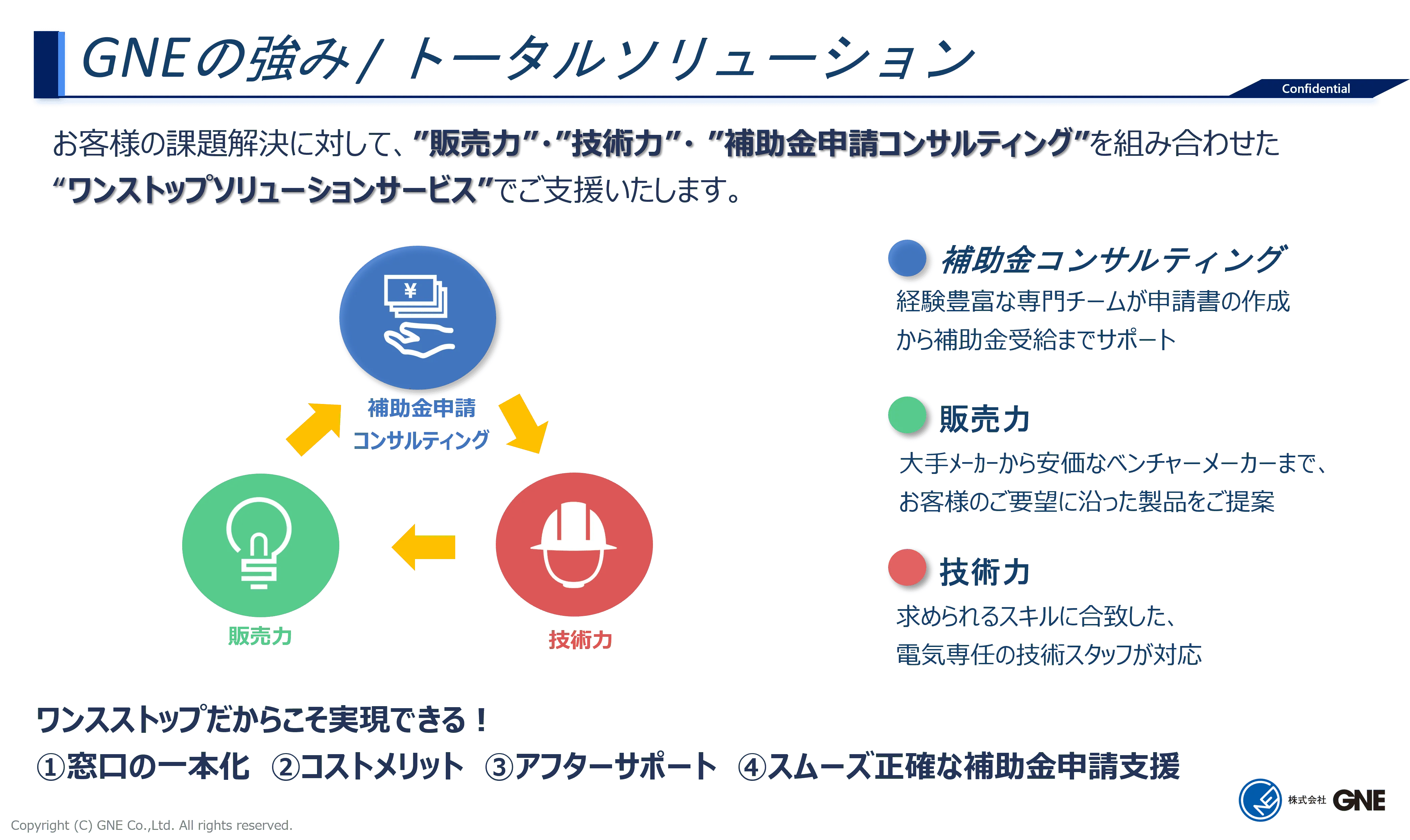 我々の強みと致しましては、メーカーではない立ち位置だからこそ実現できる”販売力”・”技術力”・ ”補助金申請コンサルティング”を組み合わせた“ワンストップソリューションサービスだと考えておりまして、ワンスストップだからこそ①窓口の一本化 ②コストメリット ③アフターサポート ④スムーズ正確な補助金申請支援 などの多角的メリットをお客様へご提供させていただいております。