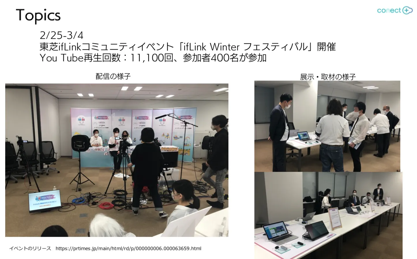 conect.plus 坂井氏 : 先日開催された「ifLink Open Community 2021 Winter Festival」(※)で成果発表を行いました。そこでは、先ほど相澤さんからお話しがあったようなifLinkオープンコミュニティのメンバー、デンソーさんや同じ東芝のプログラムで採択されているフューチャーロケットさんなどと、ifLinkの様々なサービスのアイデアを実装し、ウェビナーでお話をしました。