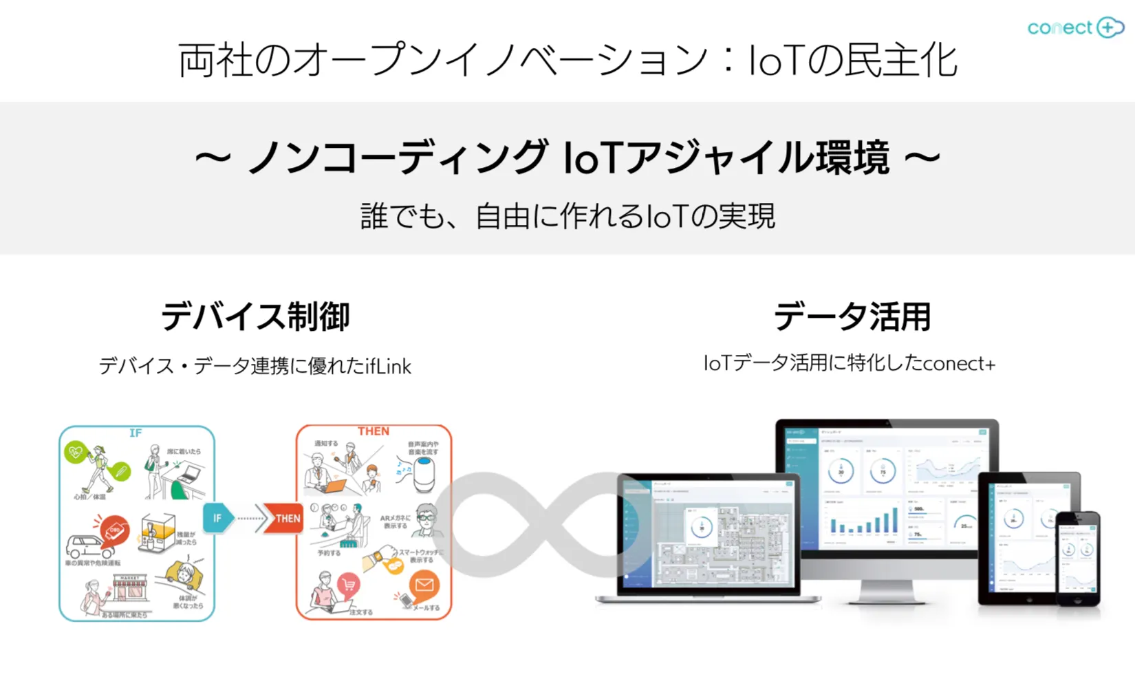 2つ目の事例は、ソフトバンクの社内起業制度からスピンオフしたconect.plus株式会社とIoTの民主化に向けて推進する「ifLink」のプロジェクトだ。東芝が設立したifLinkオープンコミュニティの中でも、いくつもの協業が生まれている。