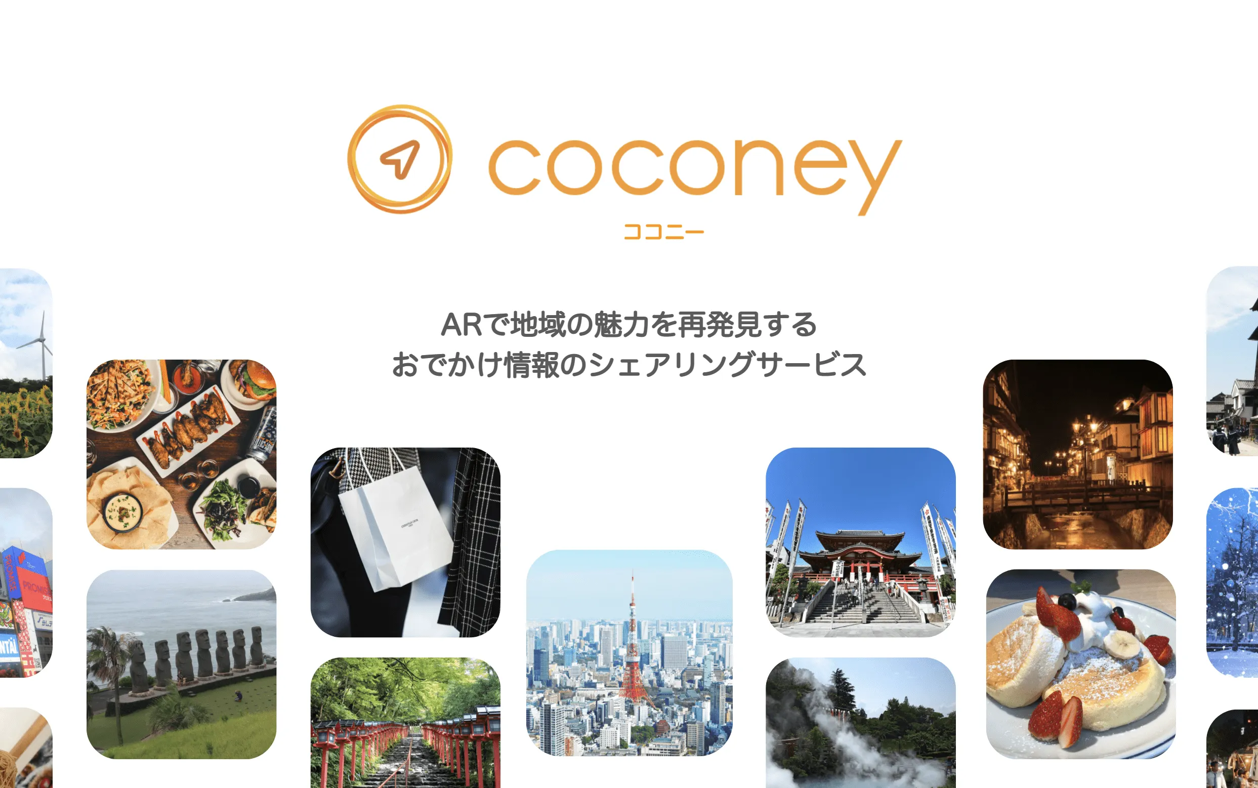 coconeyは、誰でもいつでも「おでかけ情報を検索・発信」でき、「ARナビゲーション」で迷わず目的地に辿り着けるサービスです。おでかけの際のSNS・Web・雑誌など様々な場所に散らばった「情報を探す迷子」と、目的地近くまでは着たけど、土地勘がなくあと少しの辿り着けない「道に迷う迷子」をARナビゲーションにより解決します。