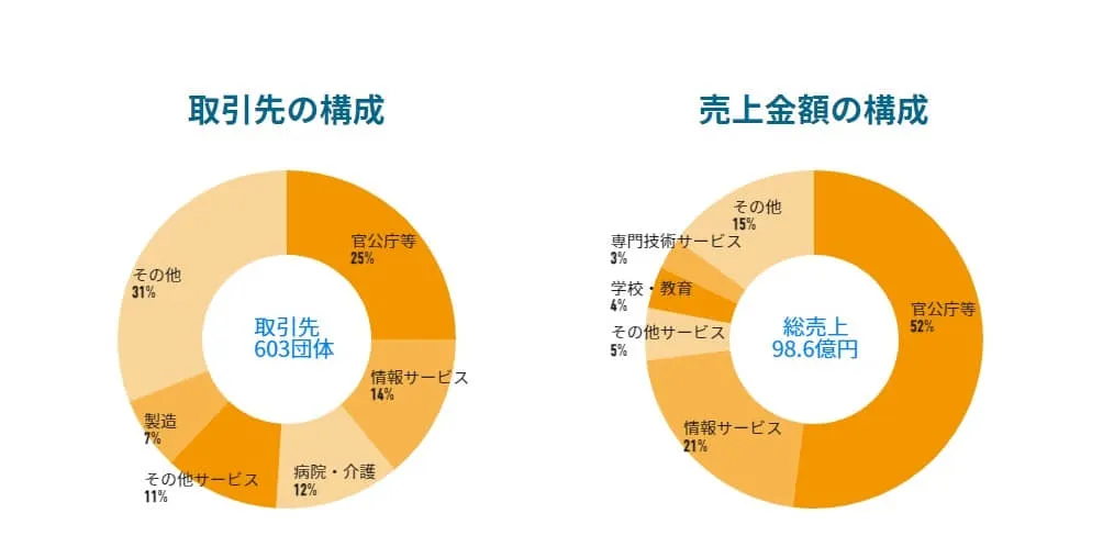 ▲「業績ハイライト」より。官公庁を中心に多岐にわたる取引先にソリューションを提供している。