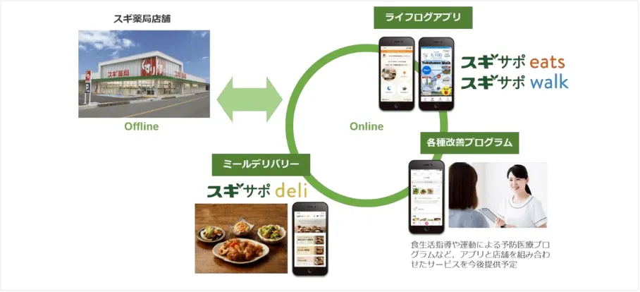 具体的には、メドピアさんと協業し「スギサポシリーズ」という健康促進アプリ・ミールデリバリーサービスを企画/運営を行っています。また、健康診断の結果から将来のリスクを予測する「生活習慣病リスクレポート」を提供したり、あるいは「おもてなし便」という薬と日用品を一緒に届けるサービスを始めたり、移動販売事業を開始するなどです。昨今のコロナ禍では、オンライン服薬指導もスタートしました。