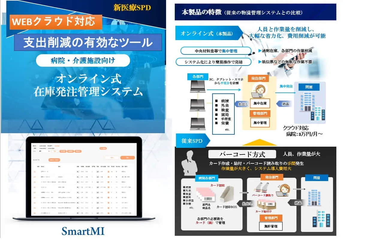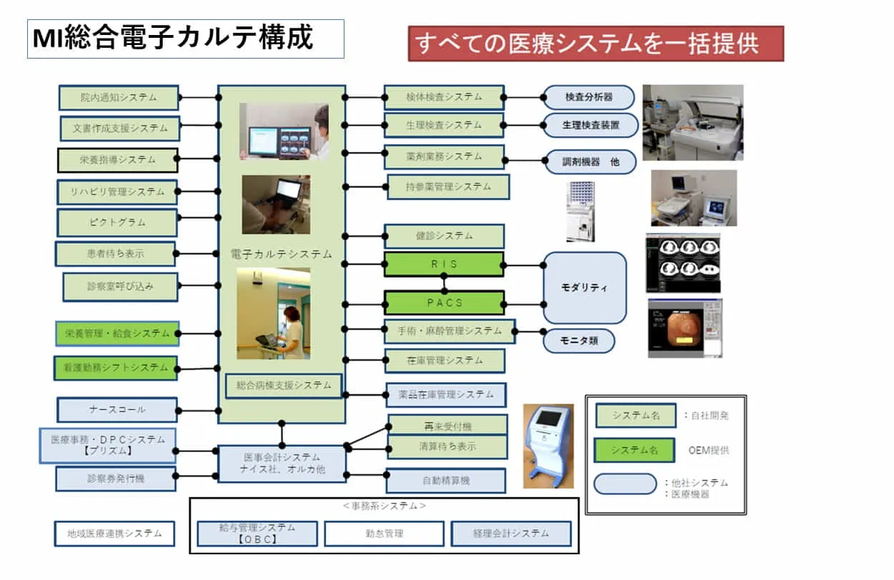 - 電子カルテを中心にした医療システムの開発を長年やっております。現在スマートMIシリーズとしてWeb対応の低価格システム販売を開始しました。また、介護関連のシステムとか含めて総合ヘルケア事業に力を入れてきています。