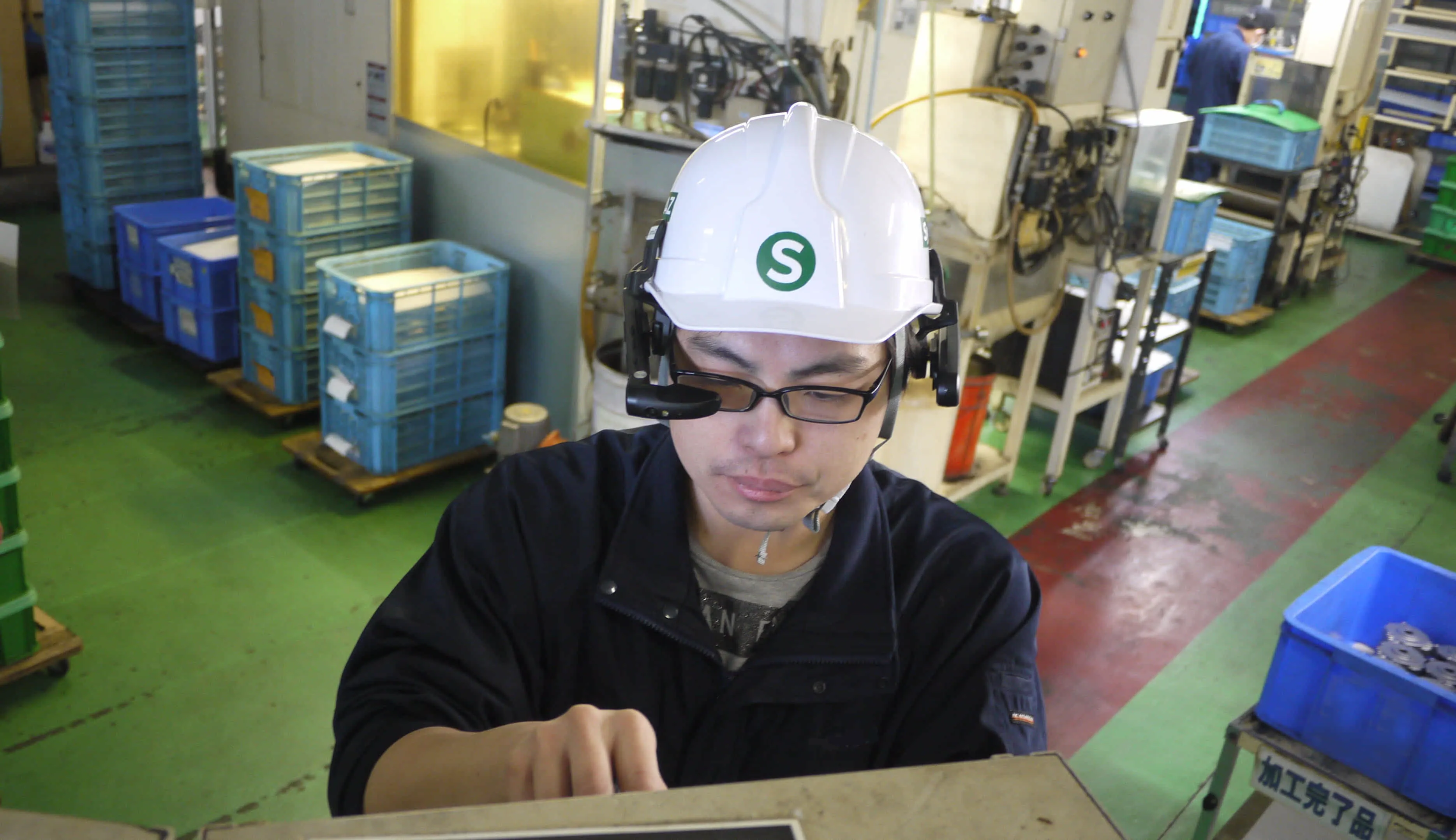 メガネ型コンピューターであるスマートグラスを用いた遠隔作業支援システムで現場と会社をビデオ会議システムでつなげます。