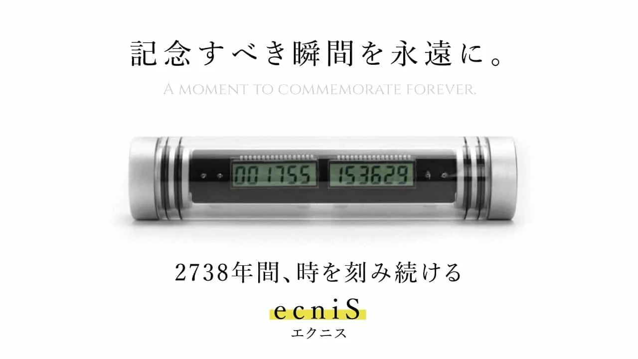 ecniS(エクニス;米国商品名:Time Since Launch)は、ピンを引き抜いたその時から、あなただけの大切な「時」をカウントし続けるパーソナルタイマーです。科学・工学において世界最高峰である米国マサチューセッツ工科大学内に設置された研究所「MITメディアラボ」の修士論文(『我々と時間との関係性を変える装置』)から誕生した製品です。ピンを引く抜くと、時を止めたり戻したりリセットすることはできません。これは製作者の強く拘った意図によるもので、もしリセットできてしまっては単なるタイマーと変わりません。リセットできないことで、初めてこの時計が意味を持ちます。一度しかスタート地点を設定できないので、本当に特別な時にだけに使うメモリアルタイマーです。