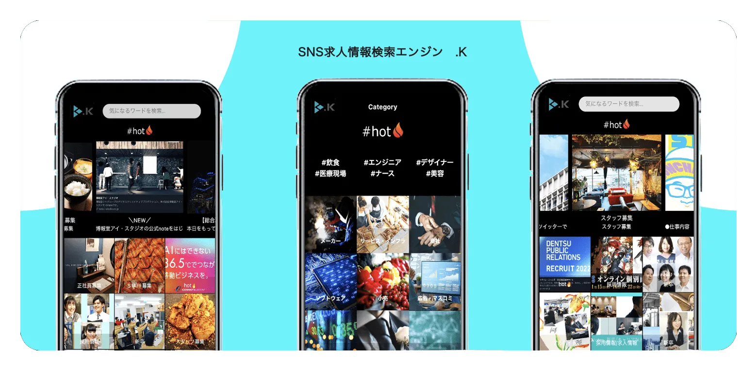 - 『次世代型 求人情報検索エンジン < .K >』 SNS上に点在する新卒採用・転職・アルバイト・派遣等の求人情報を一つのアプリケーションで網羅し、実際のSNSアカウントまで移行することができる、次世代型の求人情報検索エンジンです。
