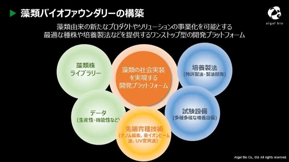 私たちは、「バイオファウンダリー型藻類開発プラットフォーム」の構築、「藻類のスクリーニング」、「藻類の育種」、「藻類の大量培養」に強みを持っております。 「健康」 「食糧」 「環境」 の分野において、持続可能な開発テーマをお持ちの企業様が抱える開発課題を解決して、共に地球の未来を健康で持続可能なものに変えていきましょう。