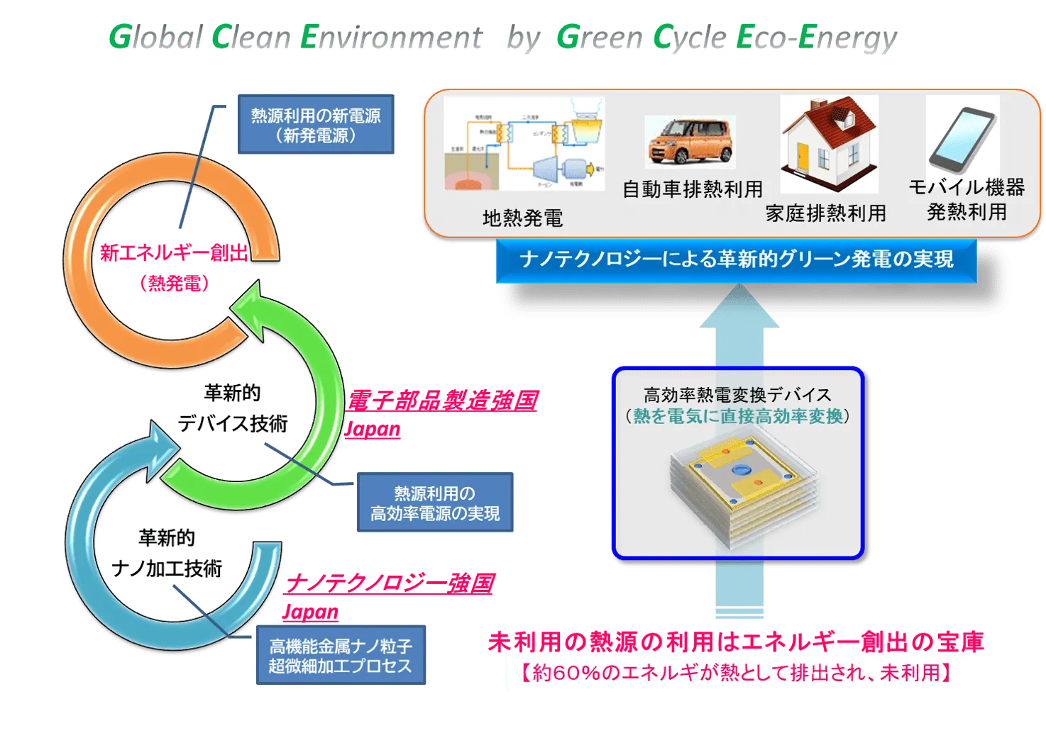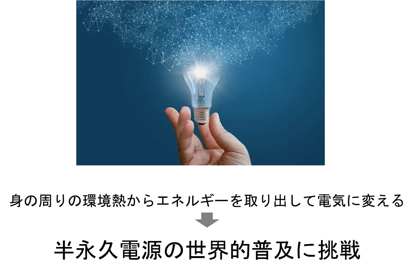 温度差不要・大出力化を射程にした熱電(熱源発電)の革新的テクノロジー「アンビエント発電」の普及と実用化で、地球温暖化抑止、カーボンニュートラル、途上国のエネルギー環境改善などに貢献します。