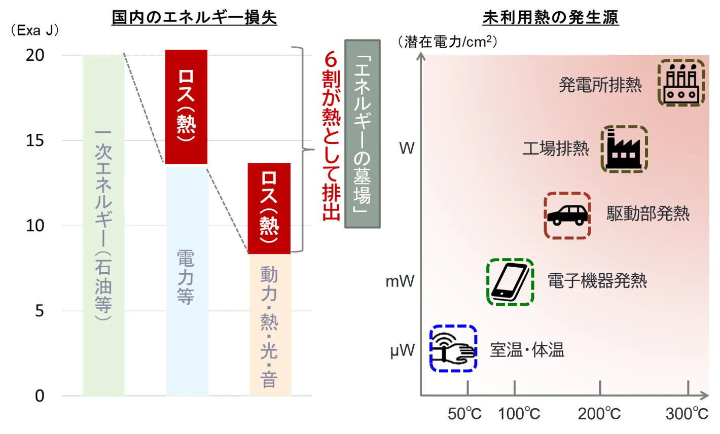 熱エネルギーを電力に変換する技術としては、蒸気タービンやゼーベック素子がよく知られています。前者は大掛かりな装置と150℃以上の高温熱源が必要となること、後者は温熱源に加え冷熱源が必要となり、また変換効率の向上や大面積化が普及の課題とされます。