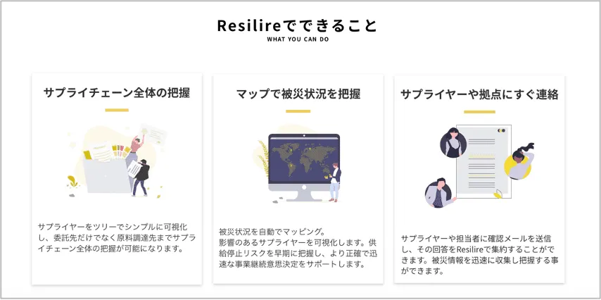 ▲サプライチェーン途絶による損害を予防するリスクマネジメントサービス「Resilire」。