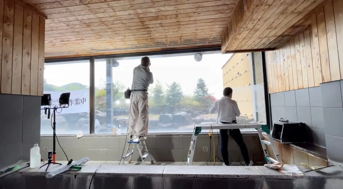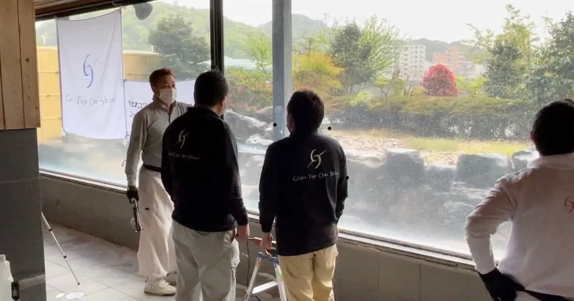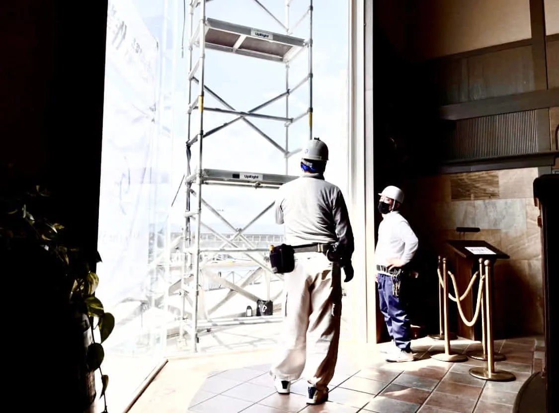 「5mの大型ガラス塩害除去及びガラスフィルム施工」