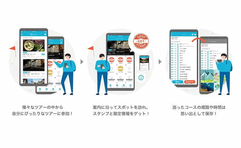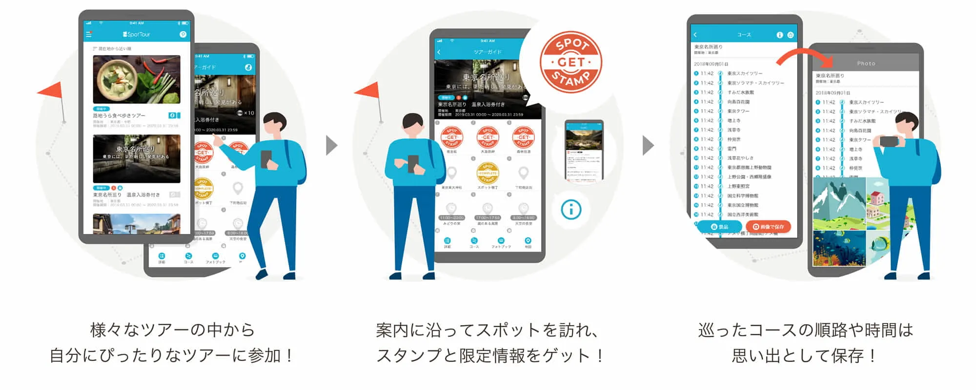 - 「SpotTour」は、最新テクノロジーによる持続可能な観光整備を実現する無料のプラットフォーム。12言語に対応し、ナビゲーション、デジタルのスタンプ、訪問日時の記録、フォトブックなどの機能を搭載し、100円で最大1億円を補償し、旅の途中でもロケーションテックで加入できる傷害保険も提供。全国50地域以上の自治体、観光会社、鉄道会社、バス会社、郵便局などが導入。