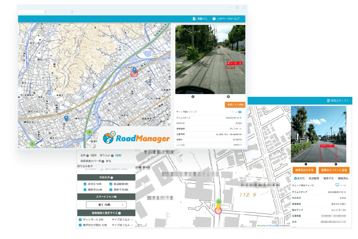 ▲すでにいくつかの自治体にも導入されている「RoadManager」。同サービスで検知した損傷はWEBダッシュボードで検索して地図上に表示したり、帳票pdfとして出力したりすることが可能だ。(画像出典:アーバンエックステクノロジーHP)