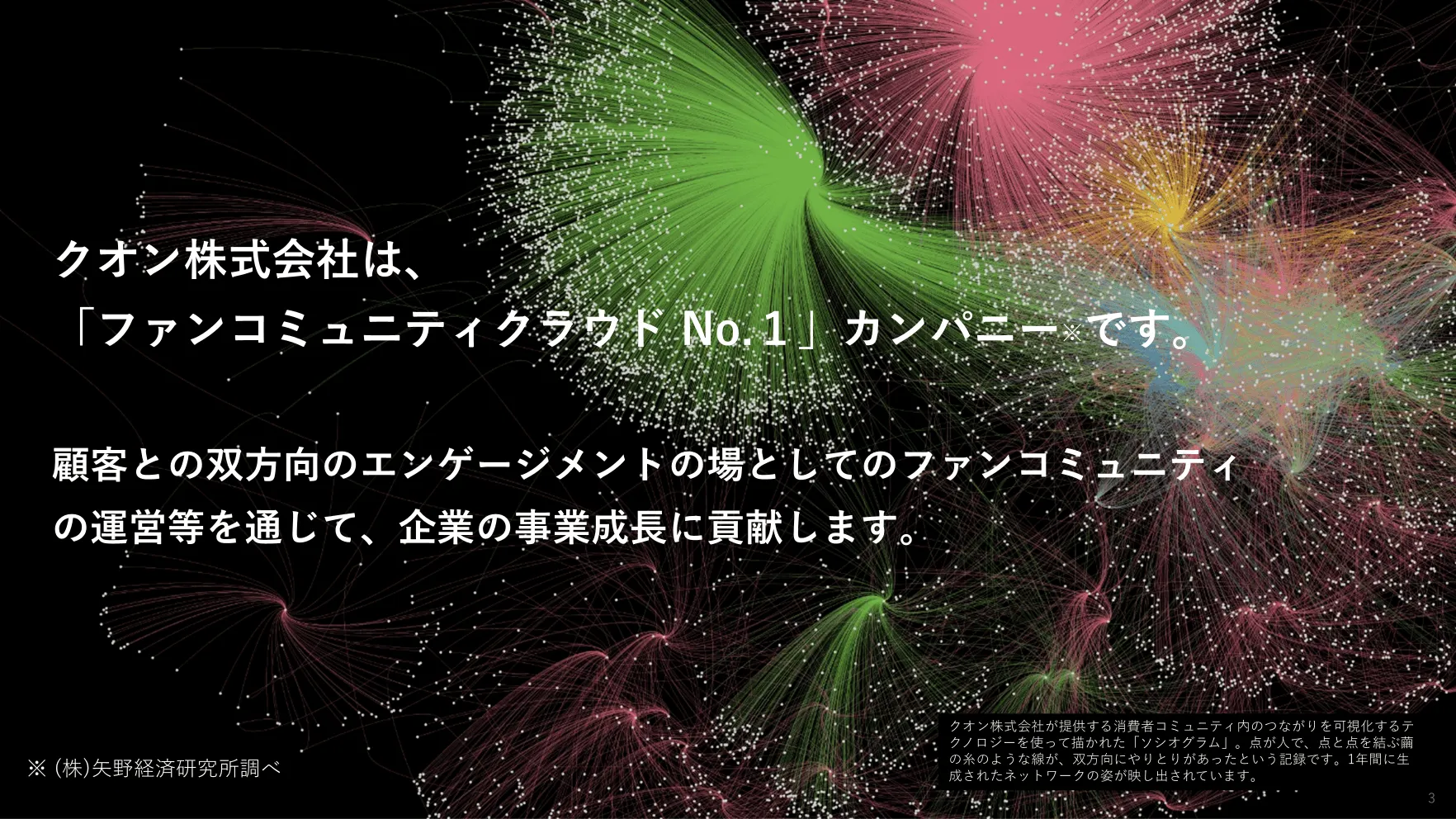 - クオン株式会社は、ファンコミュニティクラウド(BtoC向け専用構築サービス)市場売上No.1(※)の実績を持つ、企業と消費者をつなぐインターネットのコミュニティ開発と運営・コンサルティングを行う会社です。 複数の特許技術を用いたデータサイエンスを駆使し、企業と消費者との上質なネットワーク「ファンコミュニティ」を築き、ファンコミュニティの企画・運営を通じて、企業と消費者の関係構築や課題解決、持続的発展を実現しています。 ※2018年企業運営型ファンコミュニティクラウド専用構築サービス市場 事業者売上高ベース(株)矢野経済研究所調べ2019年6月現在