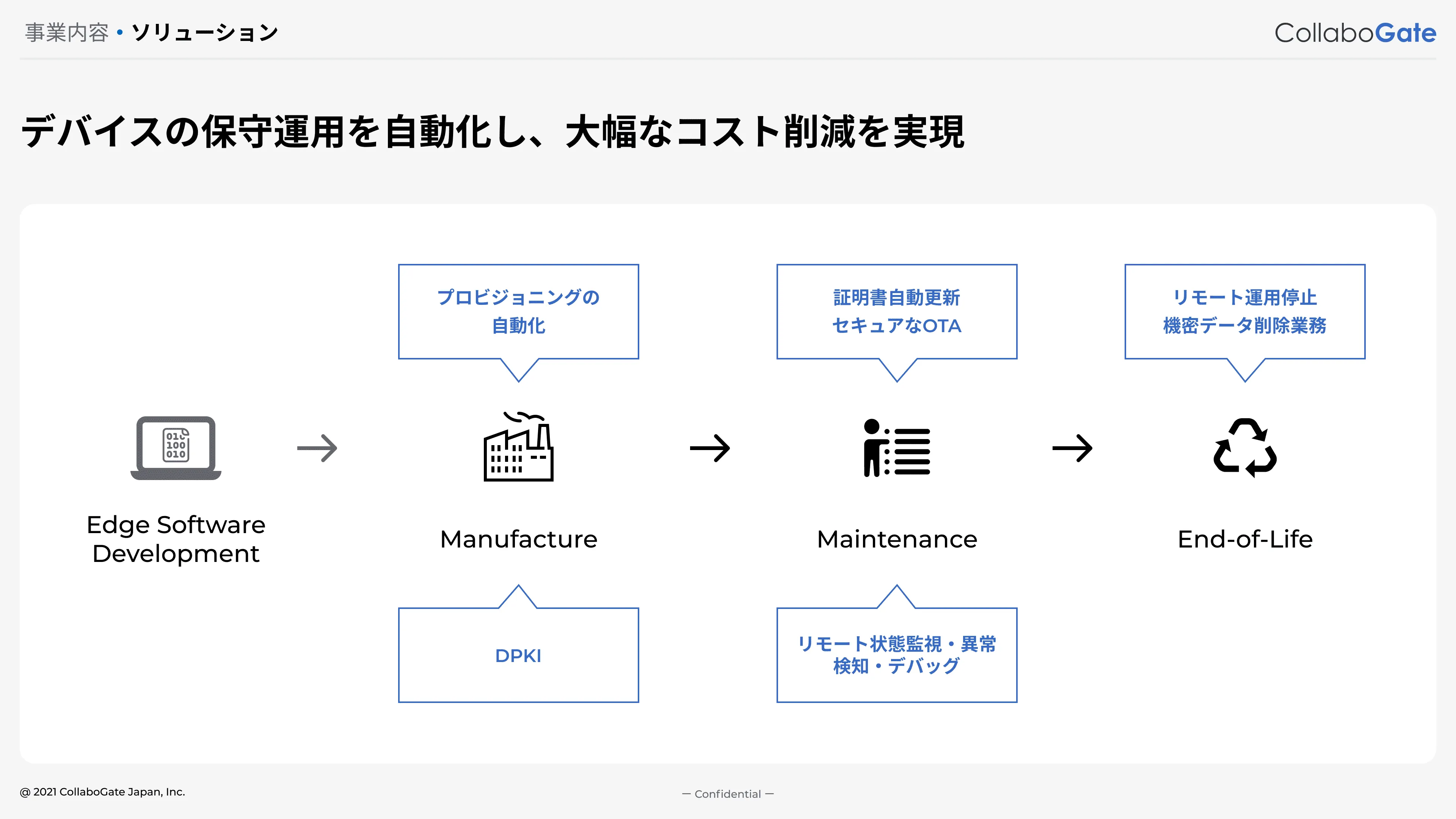 - 2030年までに世の中で使用されるIoTデバイスは累計1兆個と言われています。 IoTデバイスから取得されるデータ利活用のためには、分散型システムの上で、多様な用途・機能を有する個々のIoTセキュリティのライフサイクルを開発から破棄にいたるまでの管理が必要です。CollaboGateは、グローバル標準に準拠した分散型ID技術と暗号処理技術を活用し、専門家がいなくてもに実装できるプラットフォームを提供します。