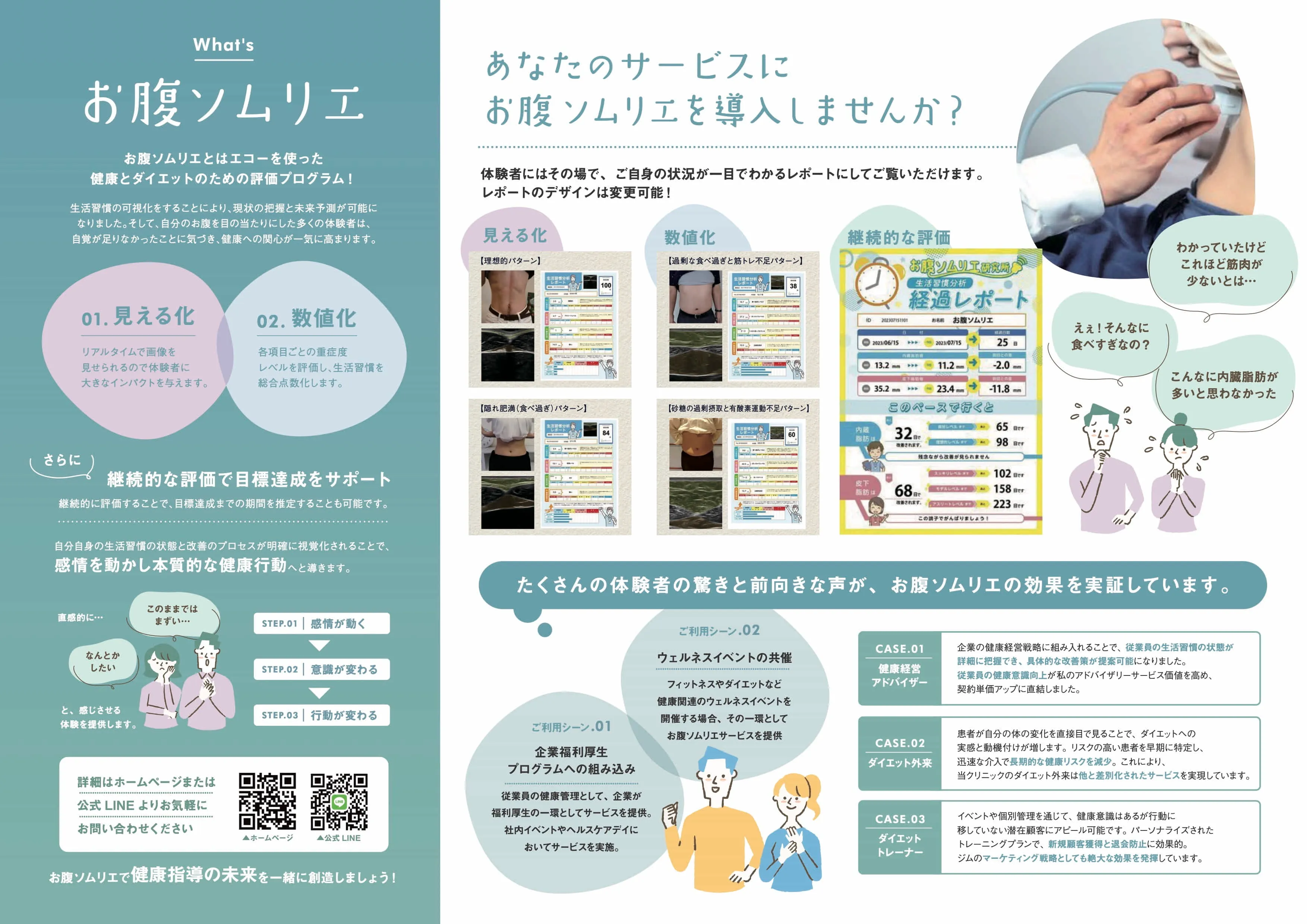 - お腹ソムリエは、超音波を用いて内臓脂肪や皮下脂肪、筋肉の状態をリアルタイムで分析する革新的な健康管理サービスです。個別の健康データを基に、最適な生活習慣改善プランを提供し、従業員の健康意識を向上させます。企業の健康経営を強化し、社会全体の健康意識を高めることを目指します。