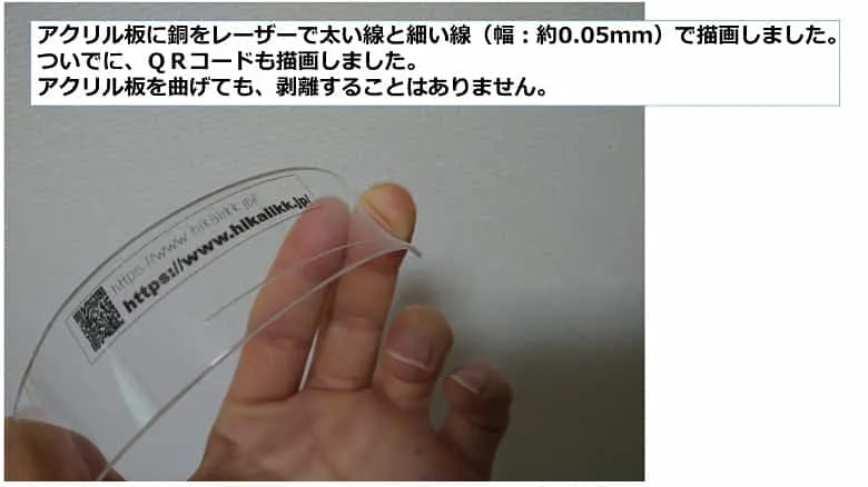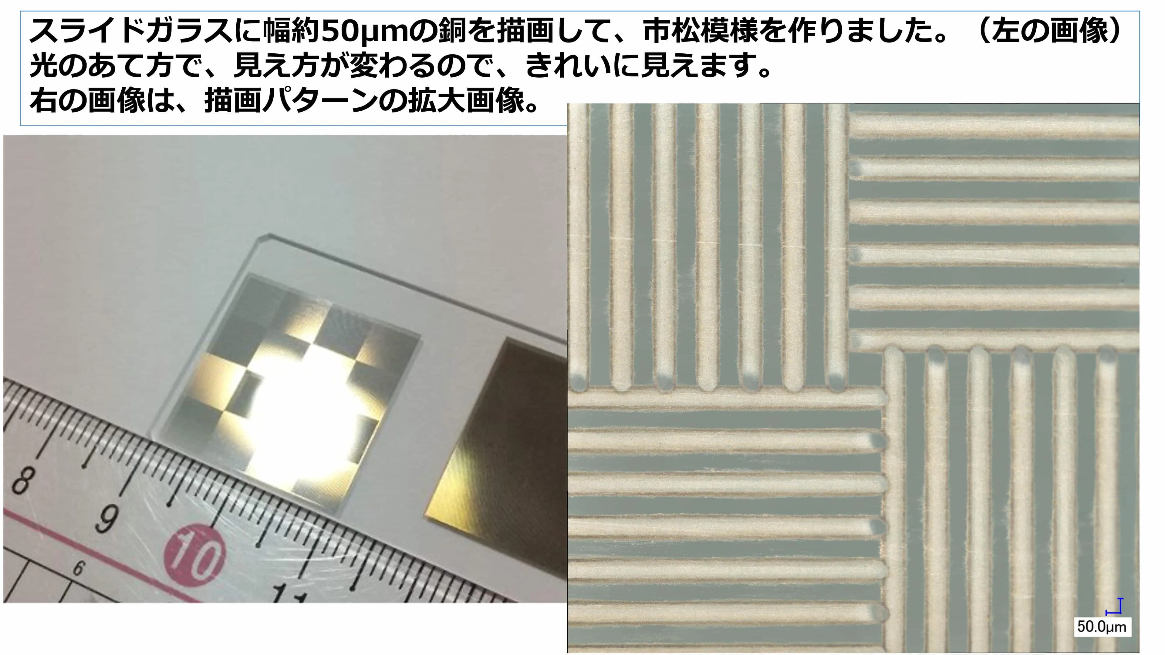 また、微細加工とはまったく違う方向性のレーザー応用で、透明基板にレーザーで各種金属の細線を自由に描くこともできます。