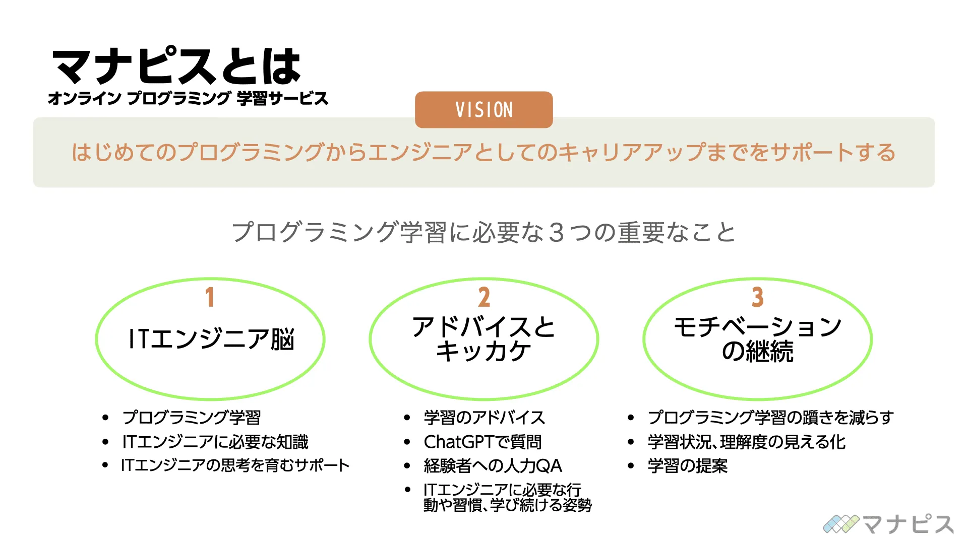 プログラミング学習の挫折を減らしデキるITエンジニアを育てることが目標です。