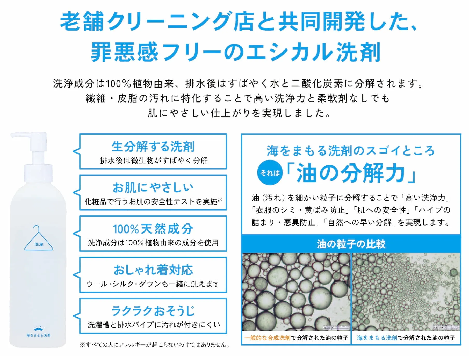 愛知県春日井市にある小さなクリーニング工場です。 ”海を汚す時代を終わらせる”ことをビジョンとして掲げ、”海をまもる洗剤”を開発し SDGsに具体的に貢献できるプロダクトを有しています。