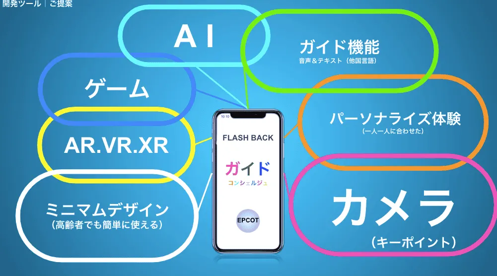 Flash Back Future(仮)は、AI「ゆるキャラ」コンシェルジュ(多国籍音声・テキスト対応)、XR技術によるエンタメ体験(歴史・未来の可視化、オリジナルルート案内)、精密なAIカメラ機能(ビフォーアフター比較、推しとのAR撮影)、遠隔見守り・健康通知、ユーザーデータ分析基盤など、地域活性と健康増進を両立する革新的リソースを提供します。