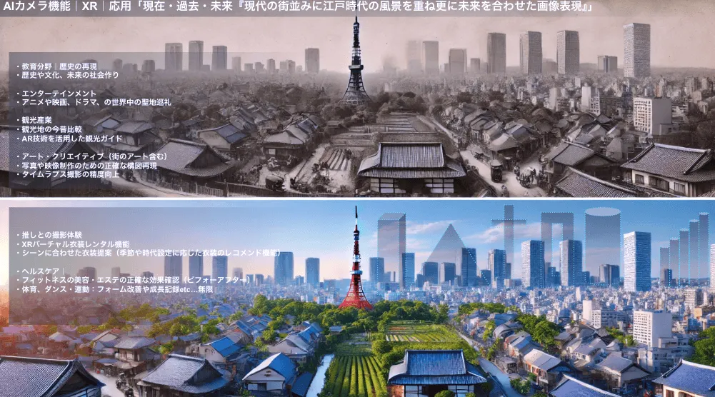 - AIカメラ機能(精密な画角・構図合わせ、ビフォーアフター比較、アハ体験、スライド・スクラッチ・アニメーション、歴史的風景のAR再現、推しキャラAR撮影)