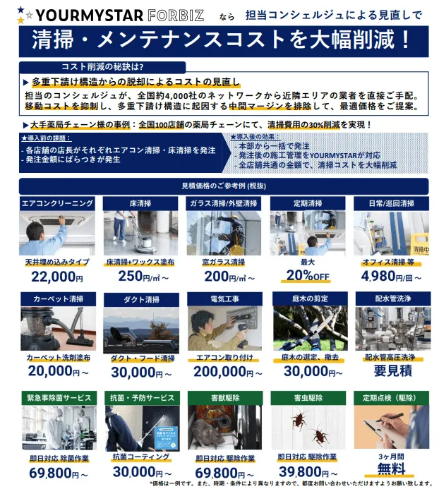 - 全国規模で多店舗展開店舗の施設管理「清掃」「除菌」コストの明瞭化・コストダウンを実現。 ※特徴は以下、4点。 ①業界課題である多重下請け構造の解消によるコストダウン ②施工内容の改善、万が一の場合は業者の変更が可能 ③全国4,000社の中から厳選した業者を選定・紹介 ④担当が付き、管理品質の担保を伴走。多拠点展開店舗も一括管理。