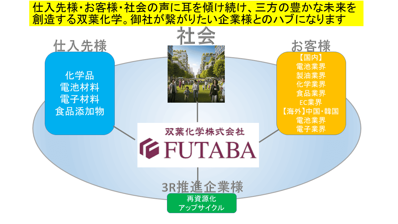 双葉化学株式会社は、化学品・工業薬品・電子機能材料・食品添加物などを取り扱う総合商社です。