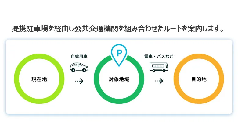 ※パークアンドライドとは、車の利用者に混雑した地域での公共交通機関の利用を促すことを目的として、指定駐車場から公共交通機関を利用して目的地まで移動する方法のことです。指定駐車場の利用権と公共交通機関の乗車券を組合せて提供するなどの手法がとられています。