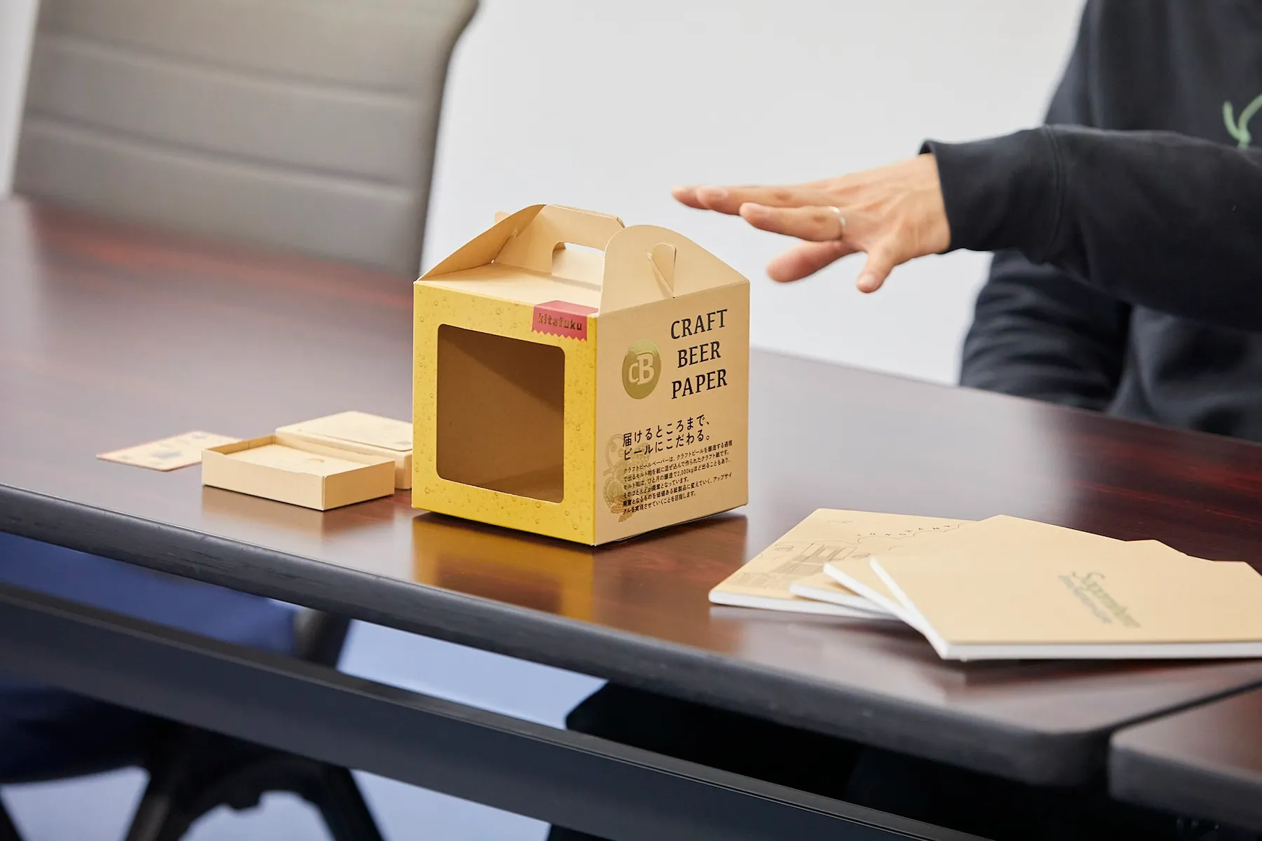 kitafuku・松坂(匠)氏: クラフトビールペーパーを使用した「ノート」「名刺」「名刺ボックス」「ギフトボックス」を制作しました。中でもノートは反響が大きく、横浜に寄港する豪華客船「飛鳥Ⅲ」の船室に置かれるアイテムとして採用されるなど、具体的な成果も生まれています。