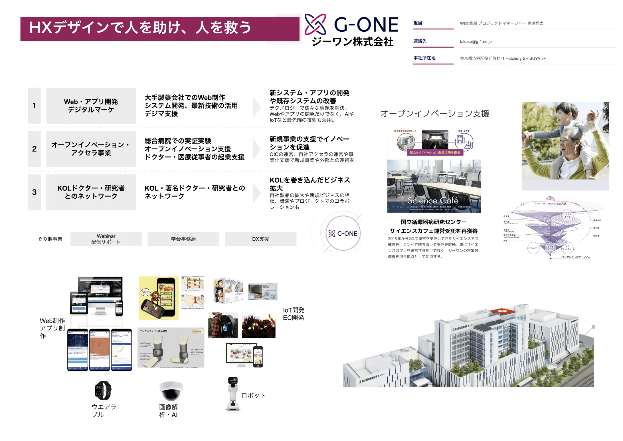 医療機関様向けにはKOLと言われる先生方との関係を元に最先端の技術を利用した、医療機関での研究開発や実証実験の支援。国立循環器病研究センターにおいてはオープンイノベーション事業の運営をさせていただくなど、新事業の創出支援にも尽力しております。