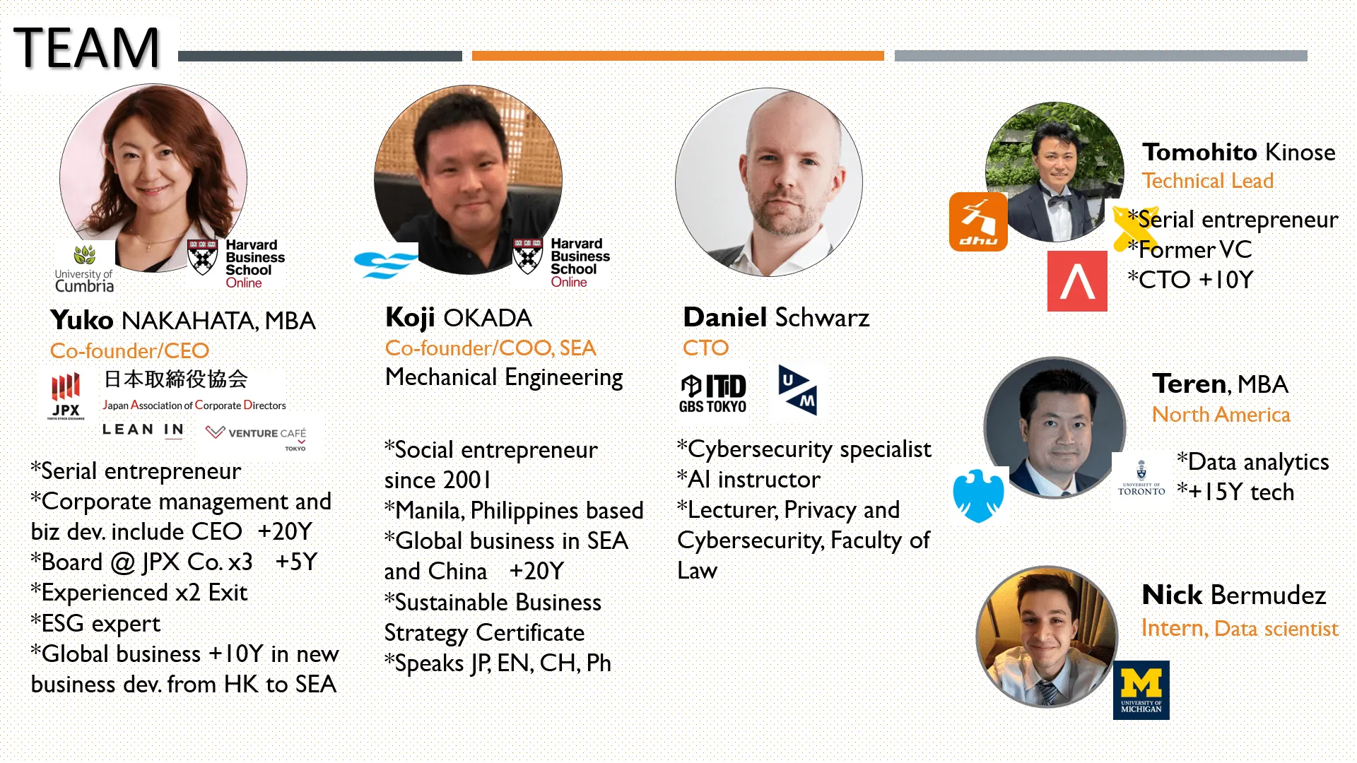 サスティナシードの創業者は連続起業家で、海外在住時、主に東南アジアでの事業開発の経験があります。帰国後は上場企業の役員を複数社歴任し、新規事業戦略とESG戦略に精通しています。チームメンバーは国際色豊かであり、海外ビジネス経験を持ち、多様性に富んでいます。