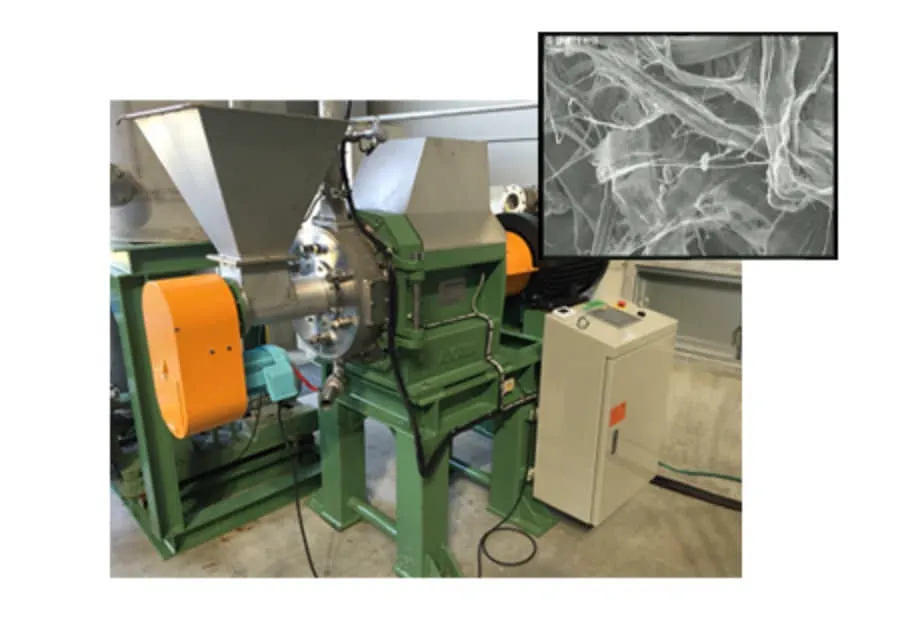 ▲相川鉄工では、CNF製造の解繊工程にリファイナー、除塵工程にスクリーン利用を適用。より効率的なCNF製造を実現すべく研究開発を行っている。