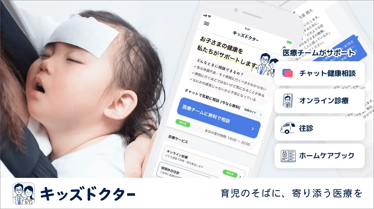 - 子供向けのオンライン診療アプリ「キッズドクター」を運営し、看護師による健康チャット相談や往診、オンライン診療など包括的な医療サービスや、ペット向けの獣医師によるオンライン相談・診療サービスも提供している。