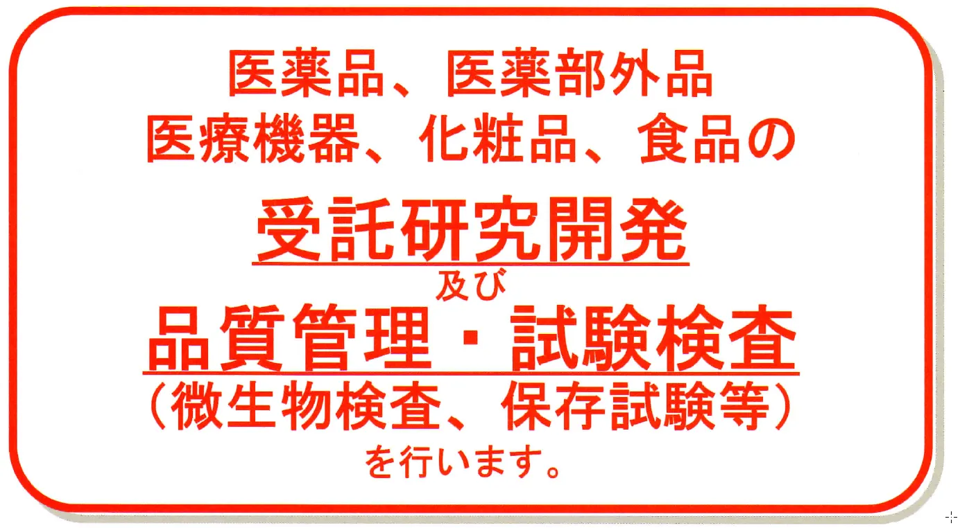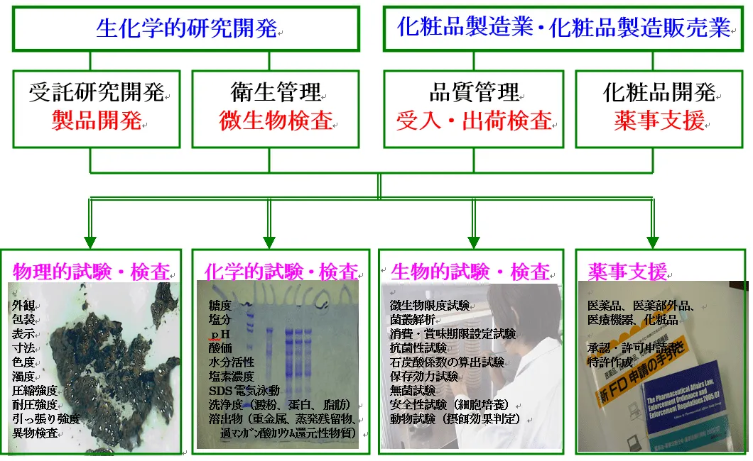 - 生化学に関連した商品開発、品質管理等を受託している。特に微生物検査、ウイルス検査(抗ウイルス効果の判定)、食品や医薬品・化粧品の保存検査(日持ち検査、保存効力試験等)、製品開発。化粧品、医薬部外品の製造業許可、製造販売業許可取得済み。