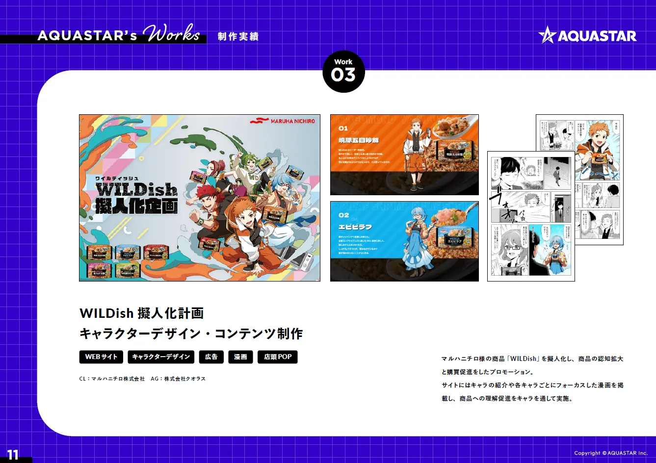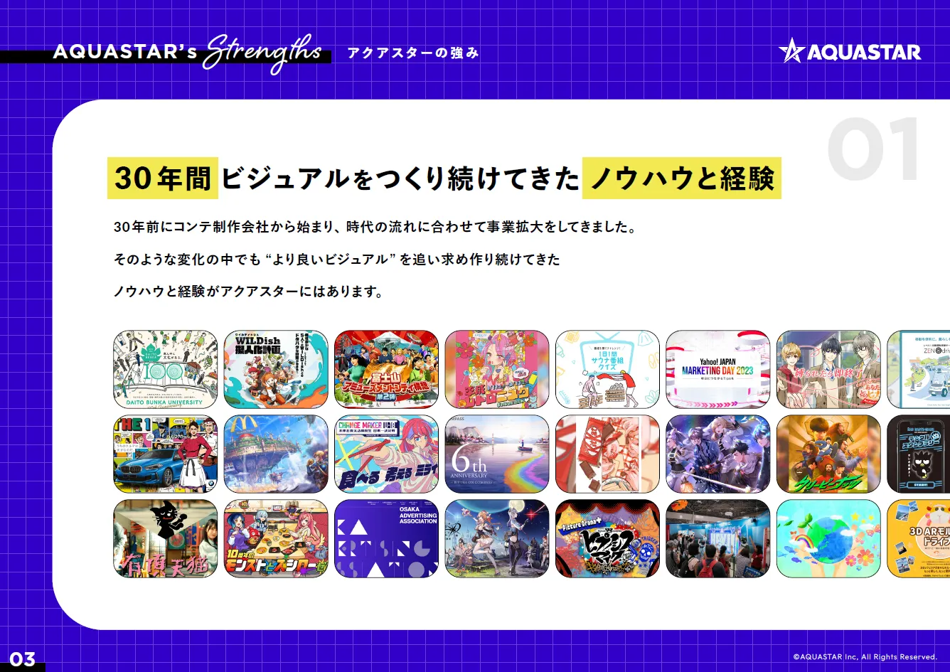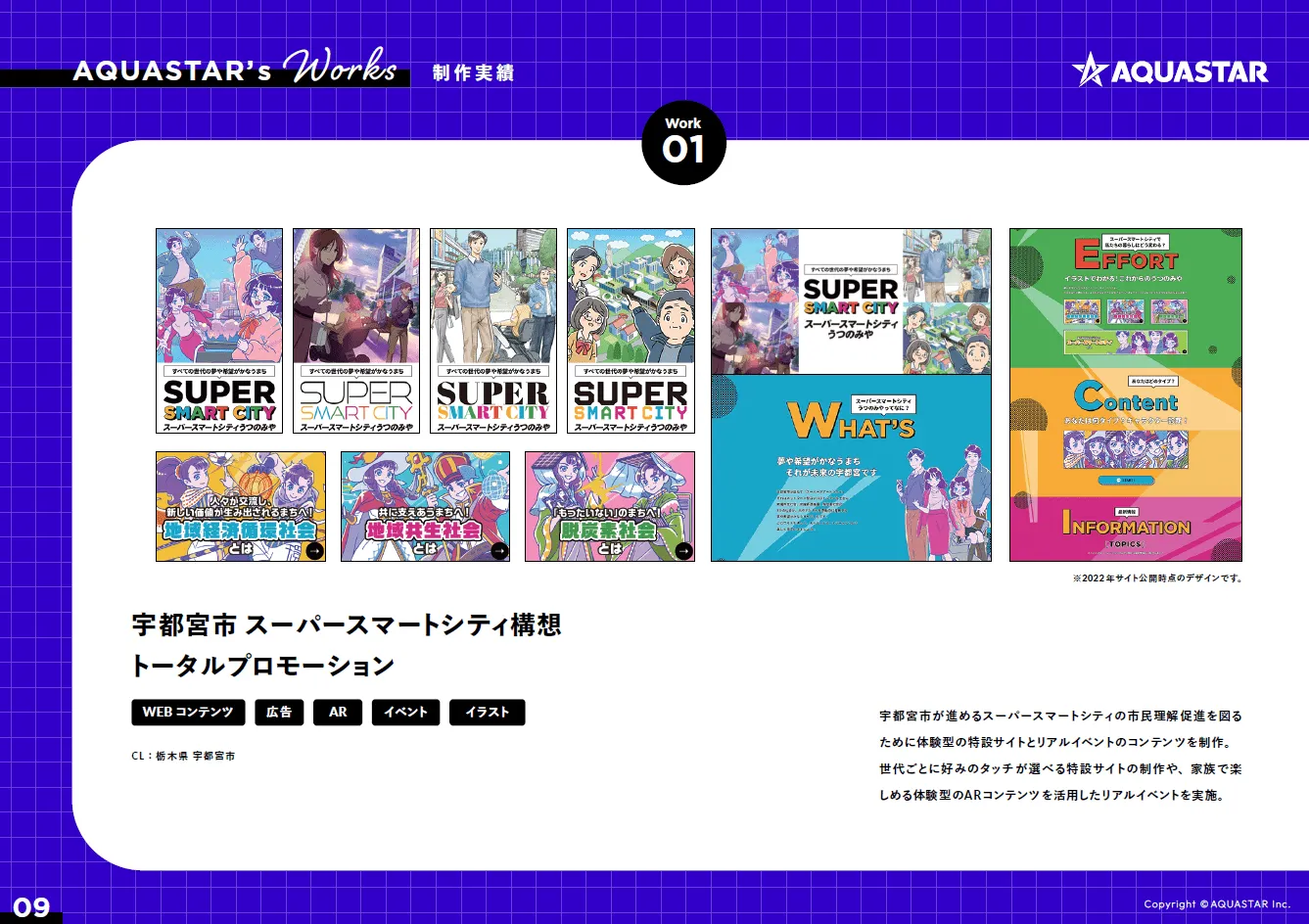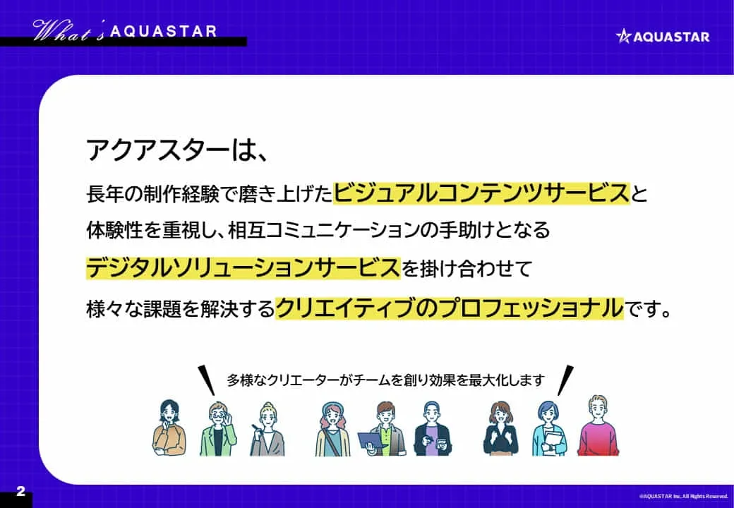 - 株式会社アクアスターは1991年の創業以来、イラストやデジタルコンテンツなどの企画・制作力を強みとする総合制作会社です。近年はWEBイラスト広告・ゲームイラストのみならず、ARやVRといったデジタル領域にも事業拡大を行っています。