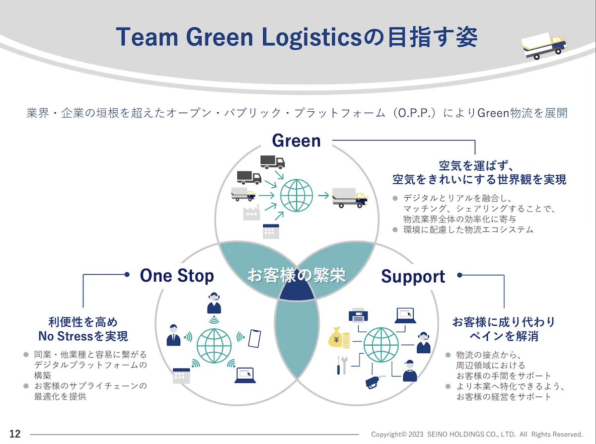 「Green」では、アセットを効率化して環境に優しい物流網を構築することを目指しています。「One Stop」については、世の中に同様のサービスが多数存在するため、消費者はどこに何を頼めばいいのか迷うことがよくあると思います。そうした際に、とりあえずセイノーに頼めば、自社のアセットや様々なサービスを組み合わせてトータルで支援してくれる、そんなワンストップなプラットフォームの構築を目指しています。