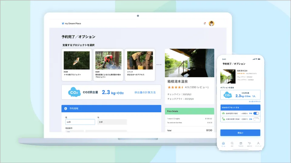 交通機関の予約システム、MaaS、旅行予約サービス、出張手配サービス、建設会社、建設DXサービス、EC、決済サービス、製品管理システム、調達・購買管理システム、カーリース、レンタカー、物流DXサービス、廃棄物管理システム、会計システム、ERP などのオンラインシステムやWebサービスをお持ちの企業様と連携することで、商品やサービス単位の温室効果ガスの自動算定とカーボン・クレジットを活用したカーボンニュートラル化を実現したいと考えています。