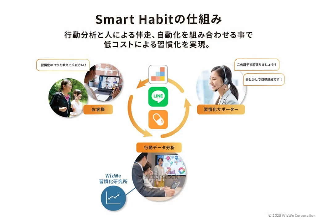 WizWeでは「習慣化」の価値を提供しています。過去3万人分の行動データを基に独自開発した習慣化プラットフォーム「Smart Habit」が、人とテクノロジーの力で一人ひとりに寄り添い、学習やトレーニングなどの習慣づけをサポート。世界中の人がありたい姿になり、達成感を感じながら、生き生きと暮らす社会を創造します。語学など教育分野の学習習慣化で髙い成果を上げ、現在は食生活、血糖値対策、メンタルヘルスにおいても活用され、高い行動定着率を実現しています。我々は黒衣の存在として全てOEMで習慣化サポートを陰で提供し社会課題を解決しています。
